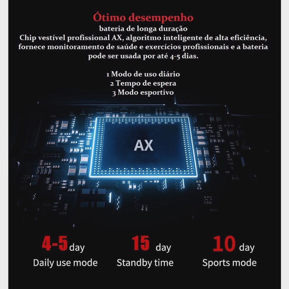 Características principais: Visor gigante de 2,0 polegadas, download gratuito de 500 + watchfaces, chr sem fio, chamada bt, assistente de voz, NFC Controle de acesso, toque independente, relógio independente, tela sempre on, lâmpada de cabeceira, fisiologia feminina, temperatura corporal, Frequência cardíaca e ecg, pressão arterial, oxigênio no sangue, sono, contagem de passos, cmera bt, msica bt, amigos, Calculadora, livro de telefone, clima, cronômetro, temporizador, alarme, Pinlock, lanterna, massagem.